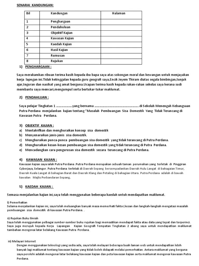 View contoh kerja lapangan.docx from aa 1contoh kerja lapangan tajuk: Contoh kerja lapangan tajuk kajian: Kerja lapangan geografi tingkatan 1 2021. Amir danish wafiq bin a halim. Sisa domestik dan masalah yang dihadapi akibat pengurusan sisa domestik yang tidak sistematik nama: Sekiranya mereka masih tidak mengendahkan peraturan, pihak .